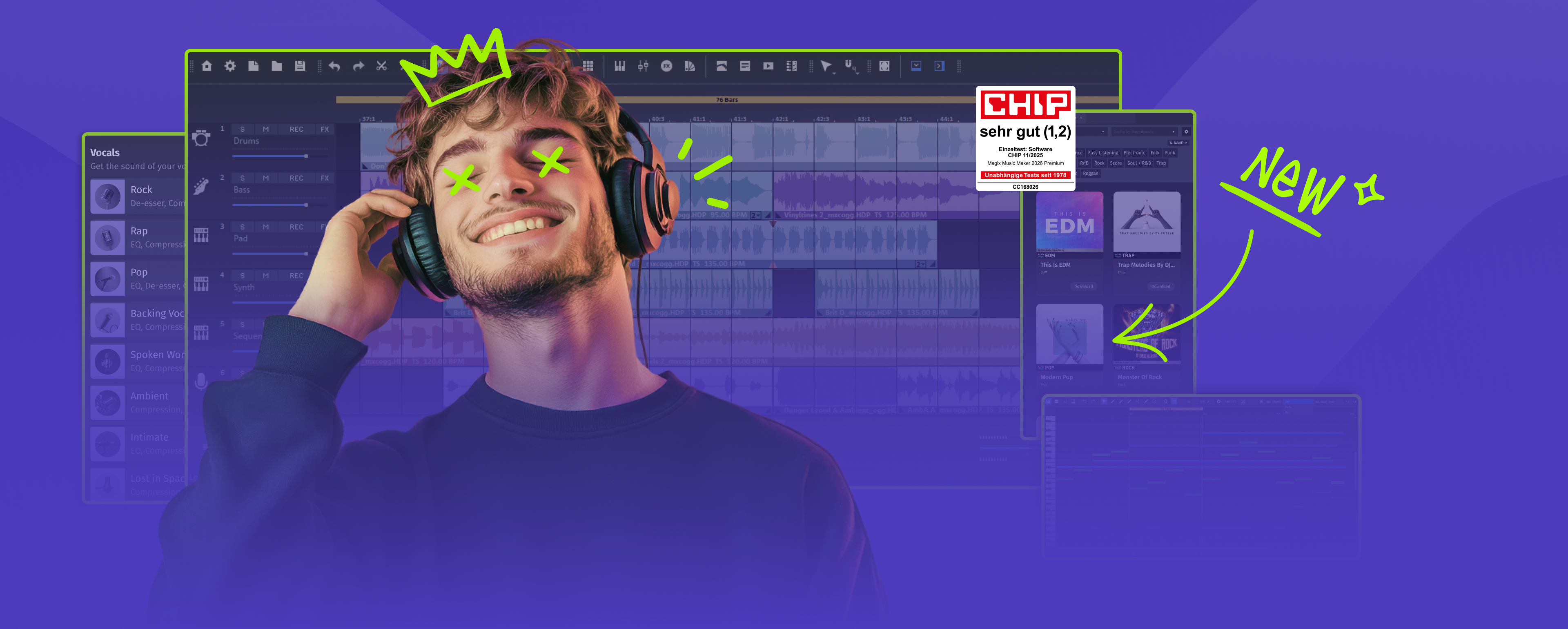 Descubra o MAGIX MUSIC MAKER – o software de música referência para iniciantes e profissionais. Aprenda a criar suas próprias músicas com este versátil programa de música para PC. Seja para criar música, produzir online ou encontrar o melhor programa para iniciantes, o MUSIC MAKER oferece todas as ferramentas para começar imediatamente.