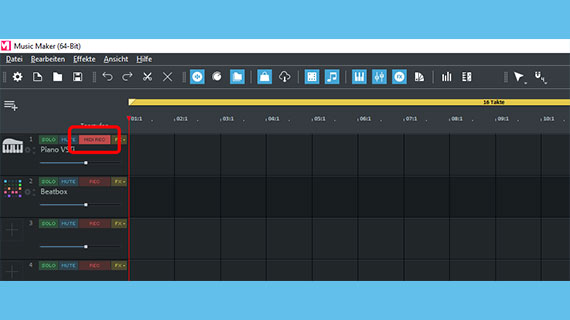 - Spur 1 ist bereits für die MIDI-Aufnahme des Piano vorbereitet. Bei anderen Spuren klicken Sie so oft auf die rote Aufnahme-Schalfläche im Spurkopf, bis dort "MIDI REC" erscheint.