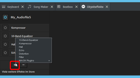 - Öffnen Sie oben in der Werkzeugleiste per Klick auf die FX-Schaltfläche die "Objekteffekte". Nach dem Öffnen erscheinen sie mit einem eigenen Tab unten neben dem Keyboard und der Beatbox.