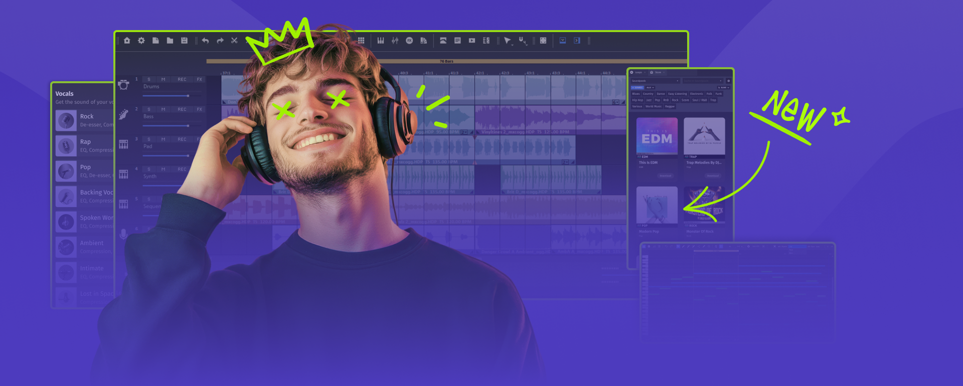 MUSIC MAKER PREMIUM inclut un navigateur de boucles optimisé pour un travail plus rapide, un nouveau filtre Genre pour un processus créatif plus ciblé et des commandes de hauteur tonale simplifiées pour un ajustement plus rapide dans l'arrangeur. Parmi les autres points forts, vous trouverez la nouvelle Beatbox Pro 3, l'édition multi-objet MIDI, Spectrum Visualizer 2 et le plug-in performant iZotope Ozone 11 Elements.