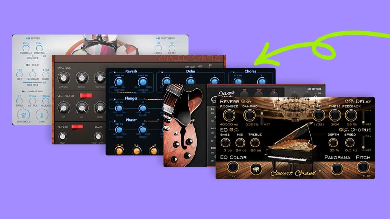 Compose melodies with Cinematic Synth, Concert Grand, Pop Drums, Analog Synths and Jazz Guitar.