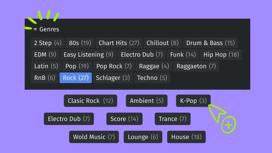 Stay in the flow at all times. The new Genre Filter shows you the best loops for your tracks, whether you're making EDM, hip-hop, or scoring a video.