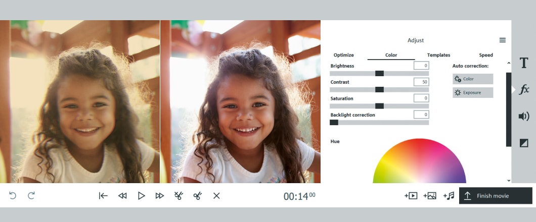 Com correções precisas em contraste brilhante dos tons do filme ou cores manuais e de filtro exato.