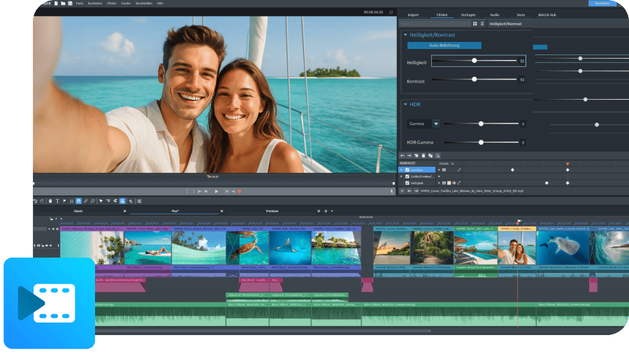 Sincroniza automaticamente a estrutura temporal linear interativa ao usar a inteligência artificial. Corta e ajeita de forma brilhantemente simples numa ferramenta do zero com filtros artísticos e profissionais interligualmente fluidos.